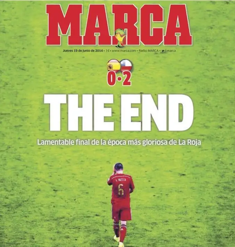 Marca mit en une des mots très durs « lamentable final de l'époque la plus glorieuse de La Roja », après l'élimination des espagnols, tenants du titre et doubles champions d'Europe, dans le premier tour du Mondial 2014.