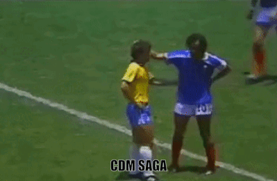 Tape amicale du capitaine français. Le joueur brésilien venant de rater un penalty.