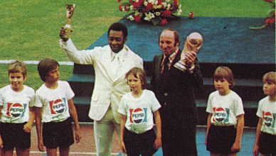 La Coupe Jules Rimet étant devenue la propriété définitive du Brésil en 1970, la FIFA mis en jeu, quatre ans plus tard, une nouvelle récompense. Pelé, symbolisant les trois victoires de son pays, et Uwe Seeler, ambassadeur du pays organisateur, furent choisis pour assurer la transition. C'est Pepsi qui parraina cette petite cérémonie malgré le partenariat liant Coca-Cola à l'instance internationale.
